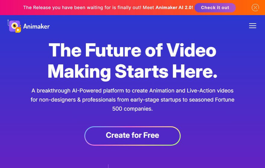 Animaker is a cutting-edge online AI animation generator and video maker designed to democratize high-quality video content creation. Leveraging advanced AI technologies like NLP, Computer Vision, and Generative AI, Animaker empowers users to create studio-quality animated videos with ease. Whether you’re a marketer, educator, or content creator, Animaker simplifies the video production process by offering features such as AI-powered animation generation, text-to-speech with a neural TTS engine, and automated subtitle generation. Its patented AI video creation from text capability allows users to transform simple scripts into engaging visual stories, making professional-grade content accessible to everyone.